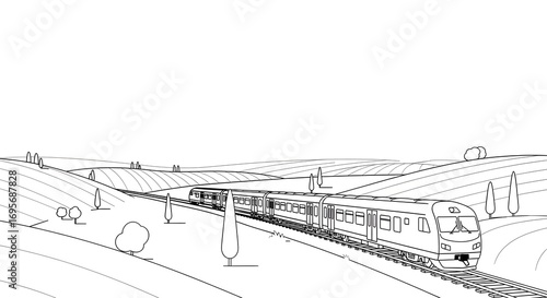 © Endog, Obraz premium Modern passenger train journeying through a serene rural landscape with rolling hills and scattered trees, depicted in a clean, minimalist line art illustration.
