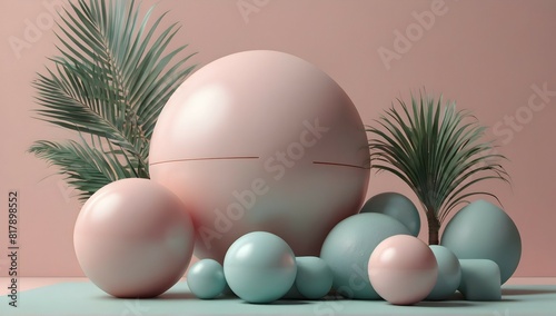 Fototapeta premium Modern Pastel 3D Composition with Spheres and Palm