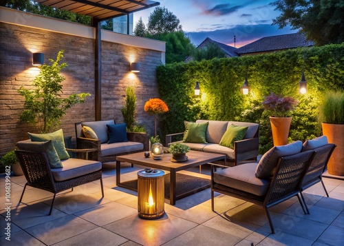Fototapeta premium Modern Patio Furniture Set in Low Light: Elegant Outdoor Living Space with...
