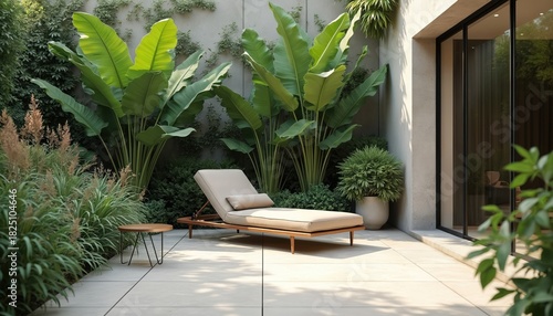 © Viktor, Naklejka premium Modern patio with chaise lounge chair and tropical plants. Sunlight falls on elegant outdoor seating area next to modern building and glass doors. Peaceful garden relax.