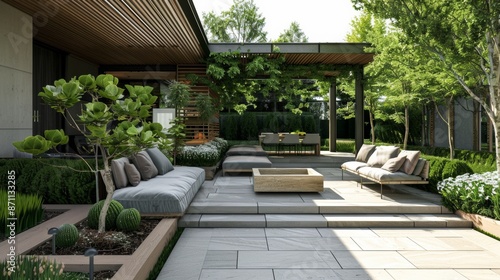 Fototapeta premium Modern Patio With Sectional Sofa And Wooden Fire Pit