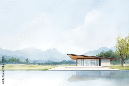 © Kitra, Fototapeta premium Modern Pavilion Lakeside Mountain View.