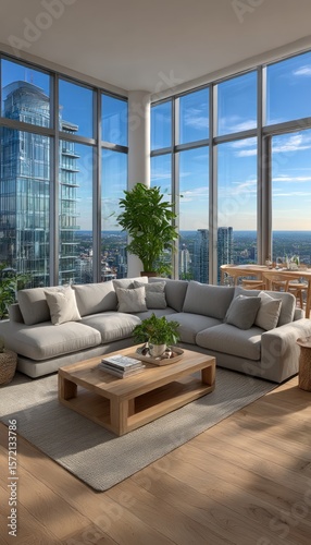 © Tahu, Fototapeta premium Modern penthouse living room with city views