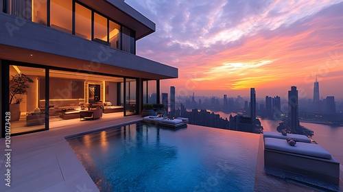© banyu bening, Fototapeta premium Modern penthouse sunset infinity pool city view