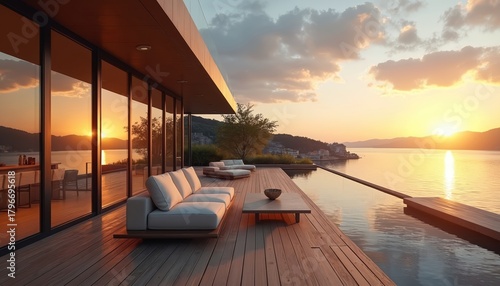 © Vadym, Obraz premium Modern penthouse terrace with infinity pool overlooking lake at sunset. Contemporary furniture on wooden deck provides luxury outdoor living space. Scenic mountain backdrop.