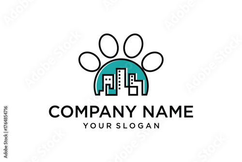 Fototapeta premium Modern Pet-Friendly City Logo featuring Dog Paw Print and Urban Buildings...