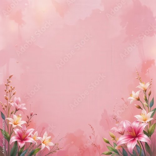 © Skyfe, Fototapeta premium Modern Pink Lily Floral Illustration Soft Pink Background - Spring, Easter, Wedding Invitations - Vibrant Botanical Design Celebratory Events