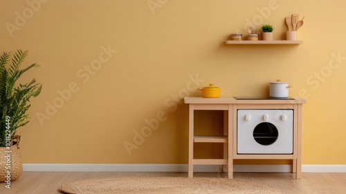 © Phanupong, Obraz premium Modern Play Kitchen with Yellow Pot and Green Plant.