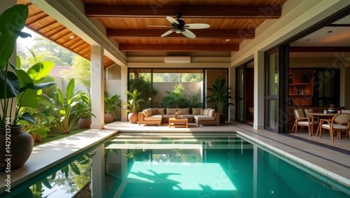 Obraz premium Modern pool area with ceiling fan and comfortable couch surrounded by lush...