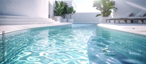 Obraz premium Modern Pool with Clear Blue Water, Surrounded by White Walls and Greenery,...