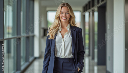 Fototapeta premium Modern portrait headshot of a friendly ceo executive business worker: A confident young businesswoman with blonde hair stands smiling in a modern office hallway, wearing a navy blue pantsuit and whi
