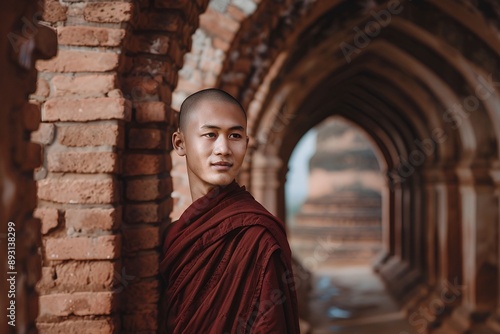 Naklejka premium modern portrait of a young Asian monk walking in an ancient temple in Bagan. He has a radiant face and vibrant eyes. Dressed in a maroon robe, he stands near an archway made from red bricks. He is rea
