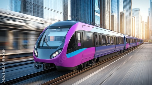 © Afan, Naklejka premium Modern purple train speeding through city.