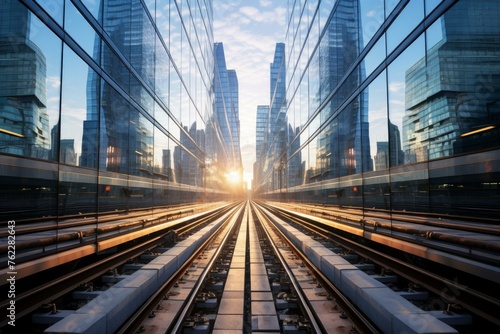 Fototapeta premium Modern Railway glass skyscrapers. Rail wagon. Generate Ai
