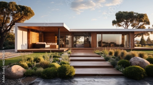 Obraz premium Modern ranch style minimalist cube house with terrace and landscaping design...