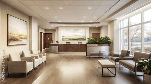 © Handz, Fototapeta premium Modern Reception Area with Wooden Flooring and Comfortable Seating