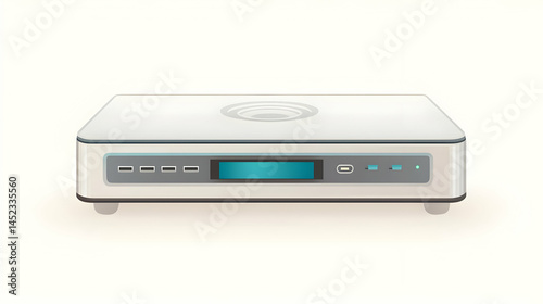 © GERHARD, Fototapeta premium Modern, rectangular, white multimedia device with a turquoise display and various ports. Features a circular base and sleek design