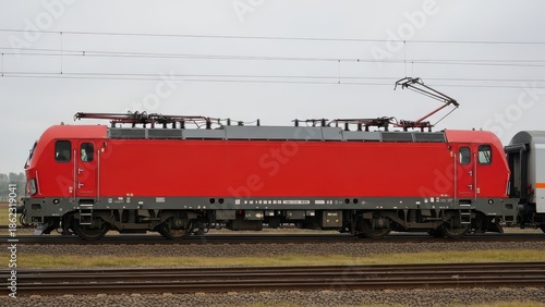 © Sadek, Obraz premium Modern red electric locomotive on railway tracks outdoors