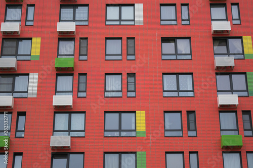 Fototapeta premium modern red facade of a multi-storey residential building, windows