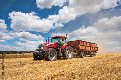 © vrstudio, Naklejka premium Modern red tractor on the agricultural field on sunny summer day