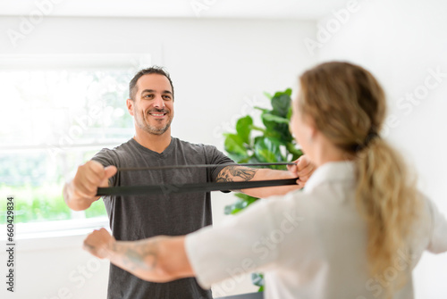 Obraz premium Modern rehabilitation physiotherapy woman with man client