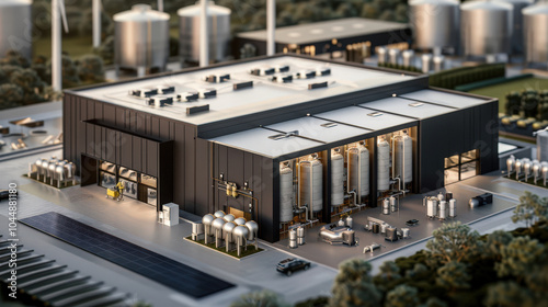 Obraz premium modern renewable energy facility focused on hydrogen production, showcasing advanced technology and sustainable practices. structure features large storage tanks and solar panels, emphasizing eco