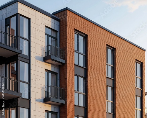 Fototapeta premium Modern residential building featuring a mix of brick and panel exteriors,...
