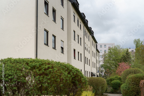 Fototapeta premium Modern residential building surrounded by greenery in a quiet urban...