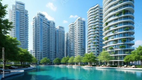 Naklejka premium Modern residential buildings with a serene lagoon.