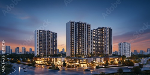 Naklejka premium Modern residential complex in urban setting during evening twilight....