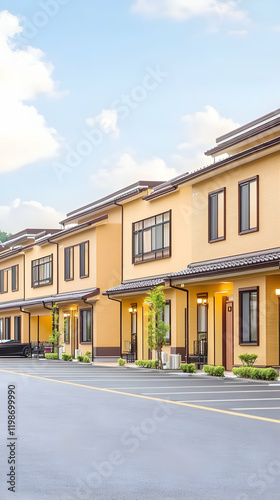 © Siasart, Fototapeta premium Modern Residential Townhouses Stand Elegantly with Parking Lot Under Blue Sky with Wispy Clouds