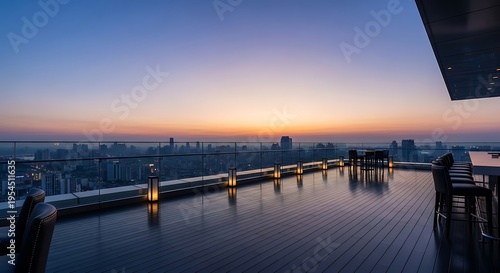 Fototapeta premium Modern rooftop bar terrace overlooking a city skyline at sunset