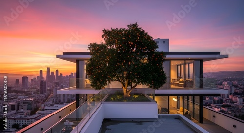 © Dissanayaka, Fototapeta premium Modern Rooftop House with Orange Tree at pink Sunset City View