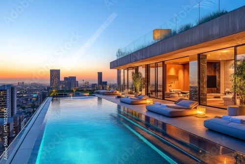 Obraz premium Modern rooftop pool with a city skyline view at sunset