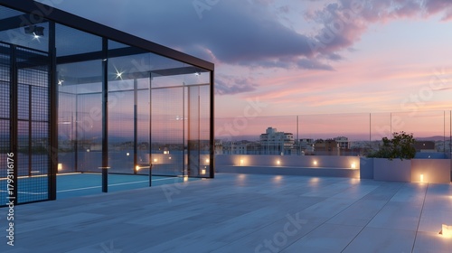 Naklejka premium Modern rooftop sports court under colorful sunset in an urban setting