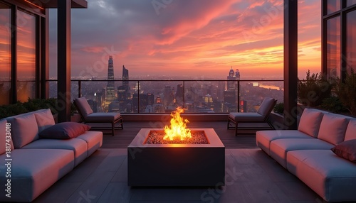 © Pete, Obraz premium Modern rooftop terrace has sofas, chairs and fire pit. Lounge zone on balcony overlooks city at sunset with orange sky. Urban architecture design for wealthy life.