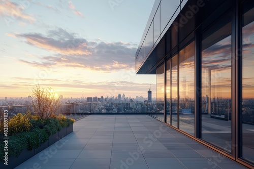 © Nakorn, Naklejka premium Modern rooftop terrace overlooking a sprawling cityscape at sunrise with warm golden light reflecting on glass building facades and soft clouds in the sky