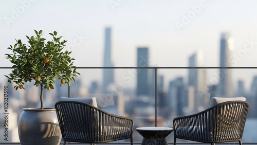 Obraz premium Modern rooftop terrace with a city skyline view and potted orange tree