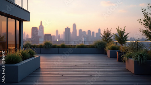 Obraz premium Modern Rooftop Terrace with City Skyline at Sunset