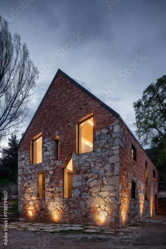 Fototapeta premium Modern rustic house made from stone and brick with warm lights glowing at dusk, showcasing contemporary architecture in a natural setting