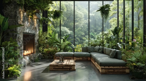 Fototapeta premium Modern Rustic Living Room With Jungle View And Fireplace