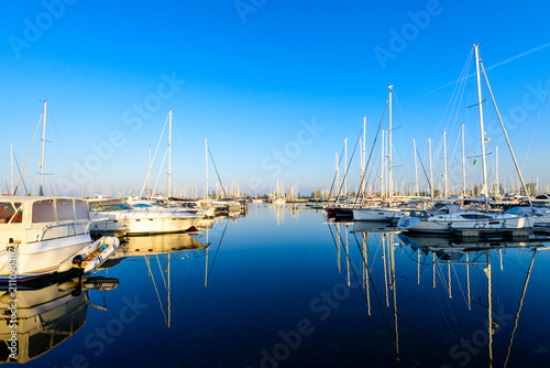 © smspsy, Fototapeta premium Modern sailboats and luxury yachts parked in the seaport on summ