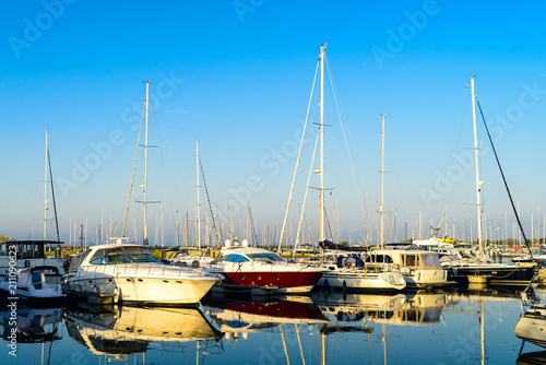 © smspsy, Fototapeta premium Modern sailboats and luxury yachts parked in the seaport on summ