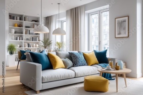© Michaela, Fototapeta premium Modern Scandinavian living room with cozy light gray sofa with patterned cushions in bold blue and mustard.