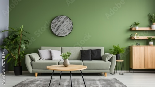 © Eva, Obraz premium Modern scandinavian living room with green sofa, chair, and bookshelf against green wall.