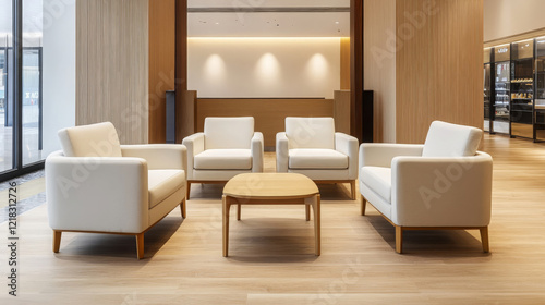 © Panupan, Fototapeta premium modern seating area in mall featuring four white armchairs and wooden coffee table, creating serene and inviting atmosphere for relaxation
