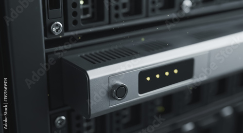 Obraz premium Modern Server Blade in Data Center Rack with Illuminated Status Lights and Control Dial, Representing Advanced Cloud Computing and Network Infrastructure for Digital Systems