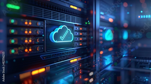 Obraz premium Modern server room with data center technology. Cloud computing and networking concept with illuminated cloud icon on server rack.