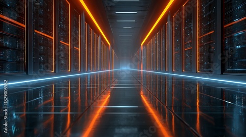 © Mitchell, Fototapeta premium Modern server room with vibrant orange and blue neon lighting, showcasing cutting-edge technology and data center infrastructure for futuristic solutions