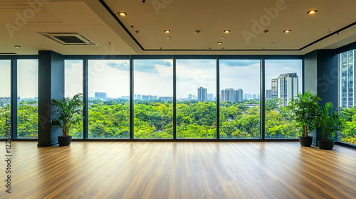 Obraz premium Modern shared office space with panoramic views of green landscape and a calm...